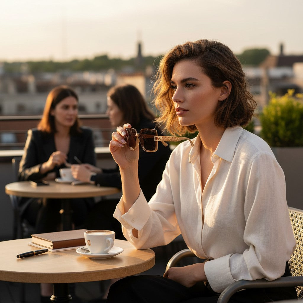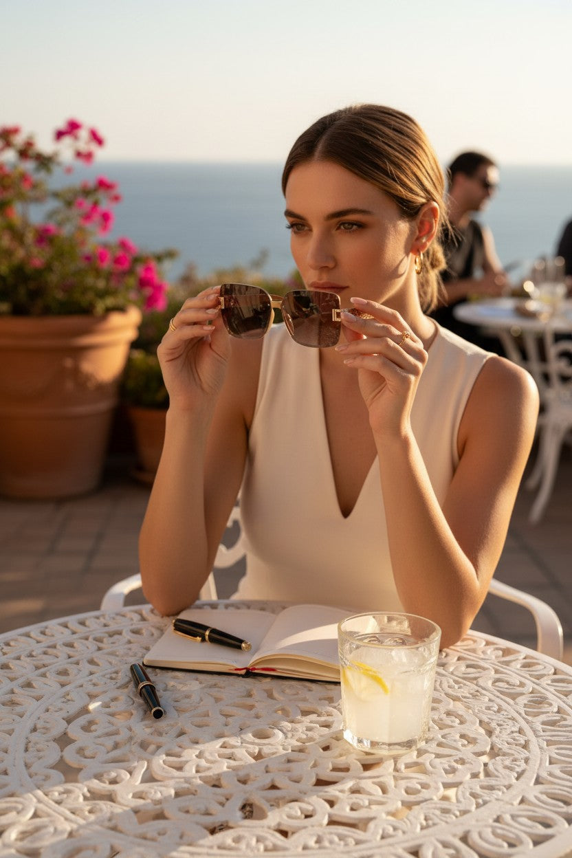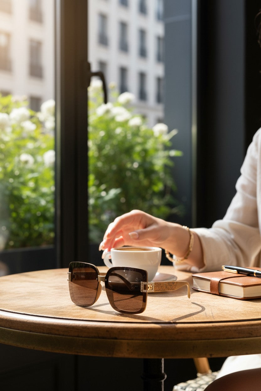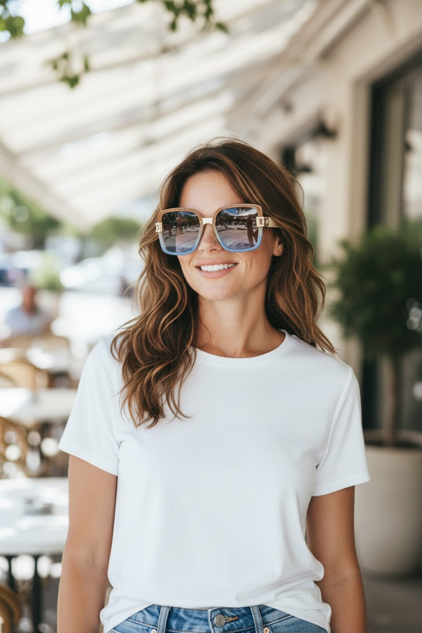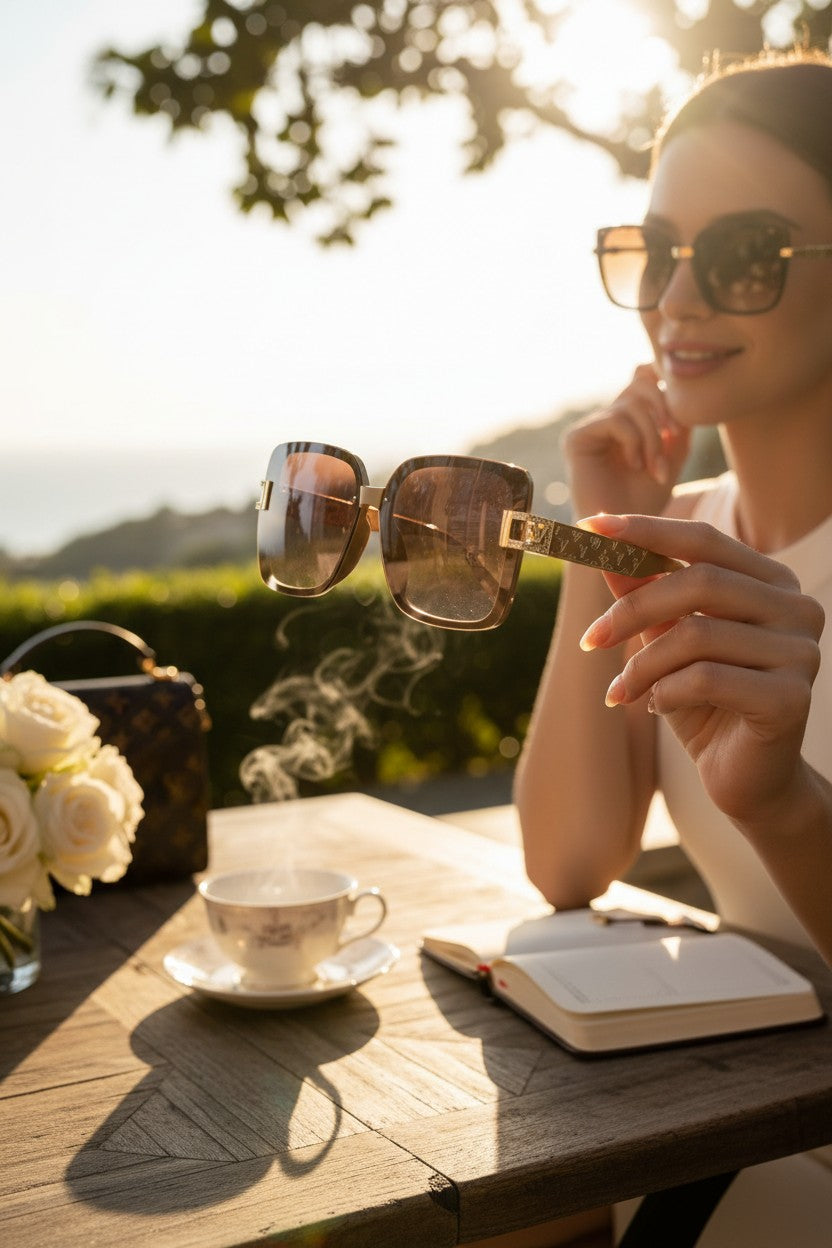 Suas lentes amplas trazem charme e proteção, enquanto o design quadrado acrescenta um toque moderno e sofisticado.